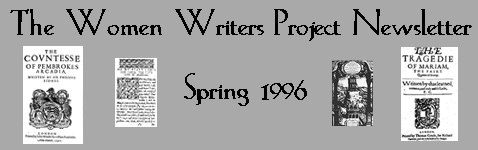 This newsletter was published for the first and only time in the spring of 1996. We expect to publish subsequent issues three times a year. We hope this newsletter will serve not only as a forum for us to share our current "goings on," but also as a magnet for information, ideas, and discussion from the larger electronic publishing community. We welcome short submissions on any topic ranging from pre-Victorian women's writing to the general field of electronic publishing. We will also be listing conferences, discussions and other activities of interest, as well as calls for papers from individuals and organizations affiliated with the WWP. Additionally, we will be posting regular updates on the availability of new texts. The newsletter will regularly feature a message from the director, excerpts from the textbase, and articles regarding electronic publishing and early women's writing in English.